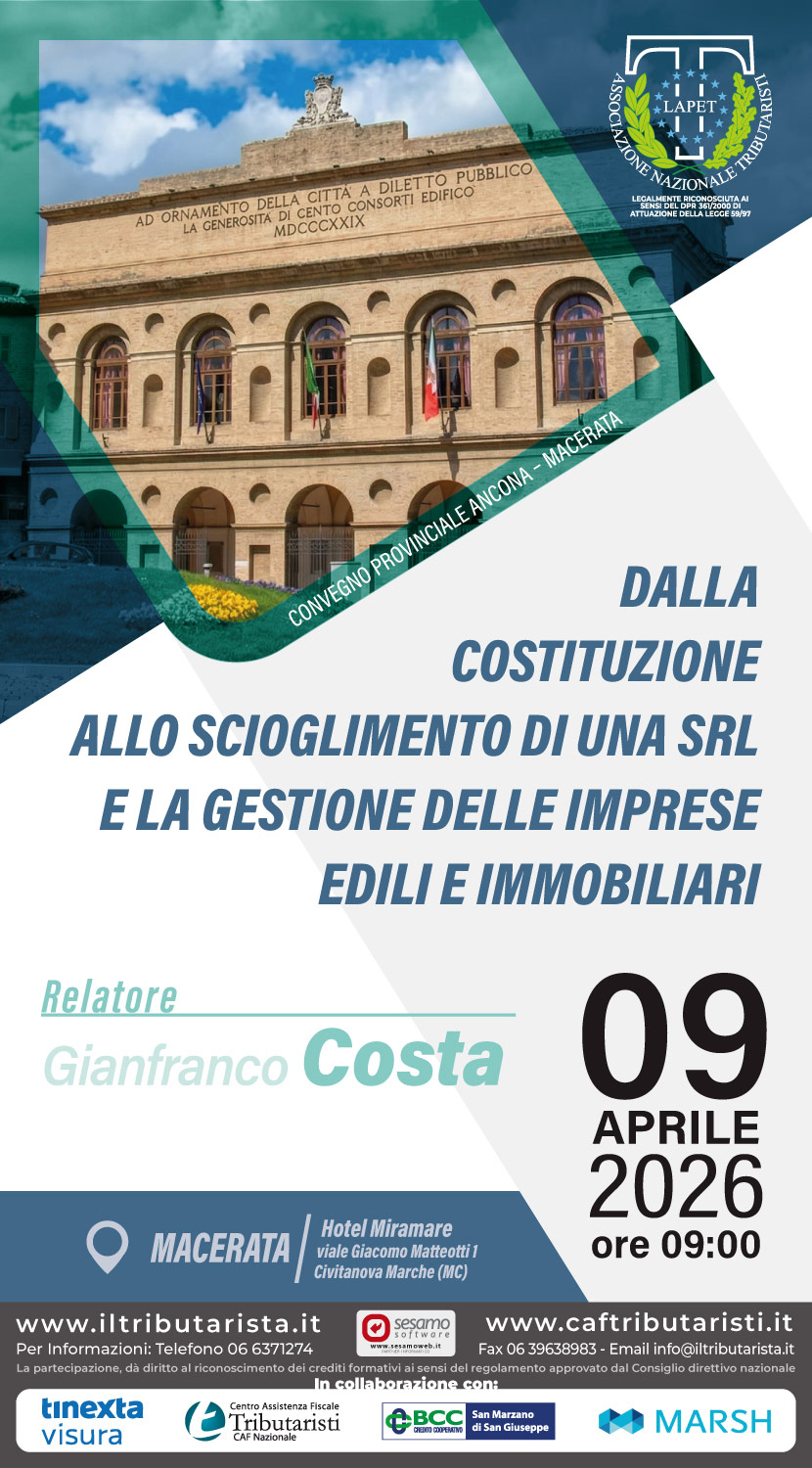 9 Aprile 2026 Macerata (MC) - 09 Aprile 2026 Dalla Costituzione allo Scioglimento di una SRL e la Gestione delle Imprese Edili e Immobiliari Relatore...