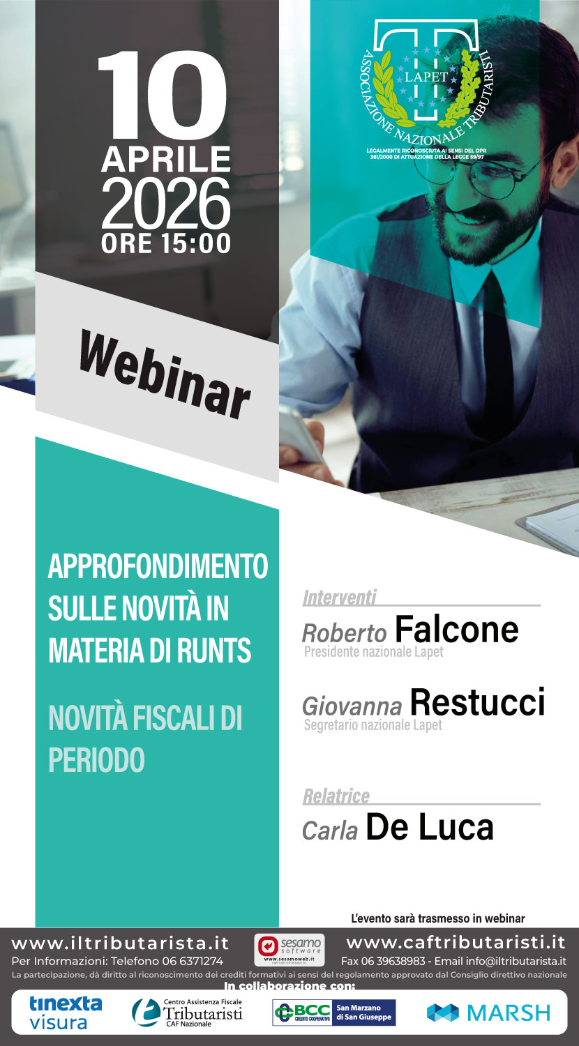 10 Aprile 2026 Webinar Nazionale del 10 Aprile 2026 Approfondimento sulle Novità in materia di RUNTS Novità Fiscali di Periodo Interventi Roberto...